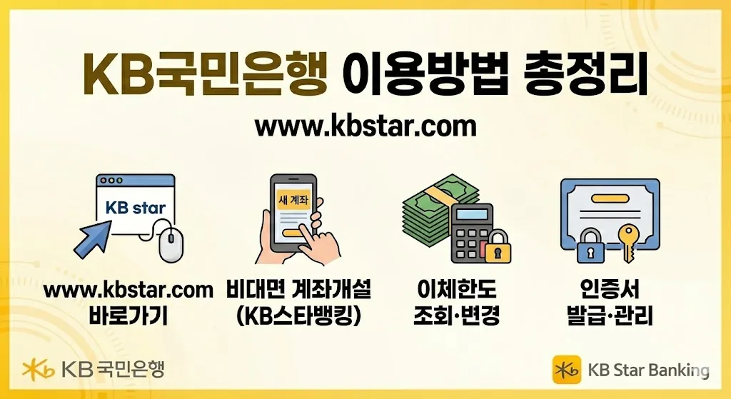 KB국민은행 인터넷뱅킹을 이용하려는 분들을 위해 필요한 모든 정보를 정리했습니다. 계좌이체, 조회, 예금/적금 가입, 대출 신청까지 은행 방문 없이 PC나 스마트폰으로 간편하게 처리할 수 있는데요. 이 글에서는 KB국민은행 홈페이지 바로가기, KB스타뱅킹 앱 이용방법, 인터넷뱅킹 가입절차, 이체한도, 인증서 발급 방법 등을 상세히 안내해 드립니다.
